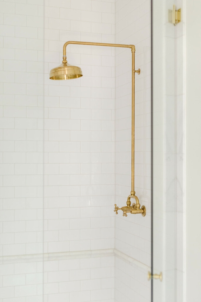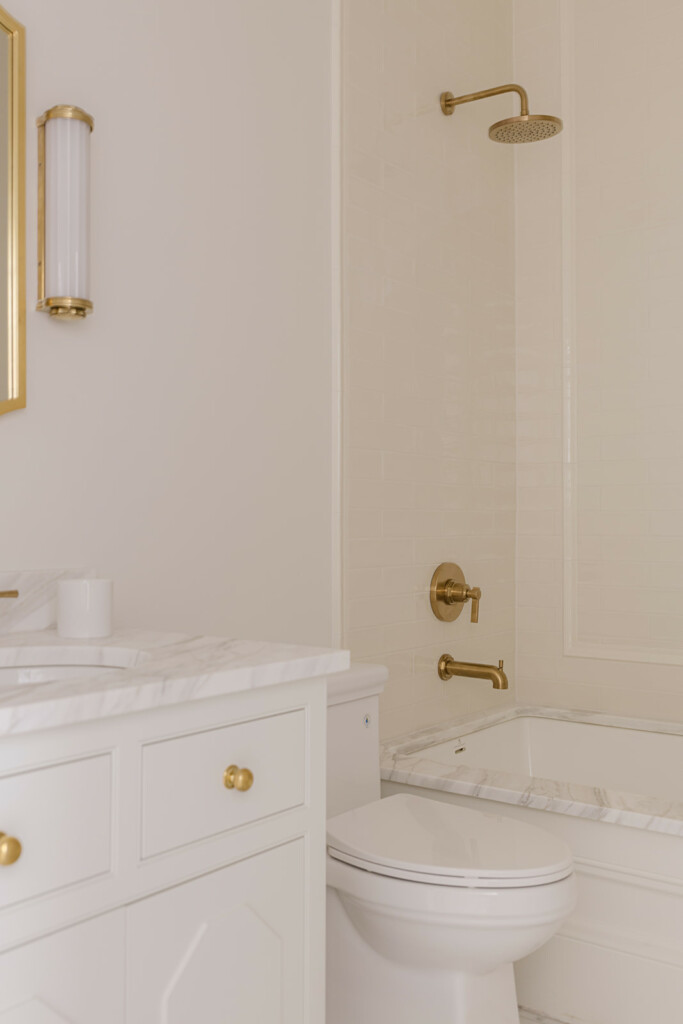 But while the guest bathrooms were an area I had a little more fun, the primary was when I got down to business. I wanted it to feel like if you lived in the Penthouse of a Ritz, tons of polished nickel, a touch of glam with the light fixtures and an insane moment with the tub. This space is very long so what I didn’t want to happen was that it felt too heavy on one side or overly cold because of all the tile. This tile and the countertops are a beautiful and subtle marble that not only exude luxury but also give a softness as well in the veining. It’s not too harsh or contrast so it’s just enough to show that’s it a real stone without being in your face. Did I mention the in-floor heating and towel warmer?