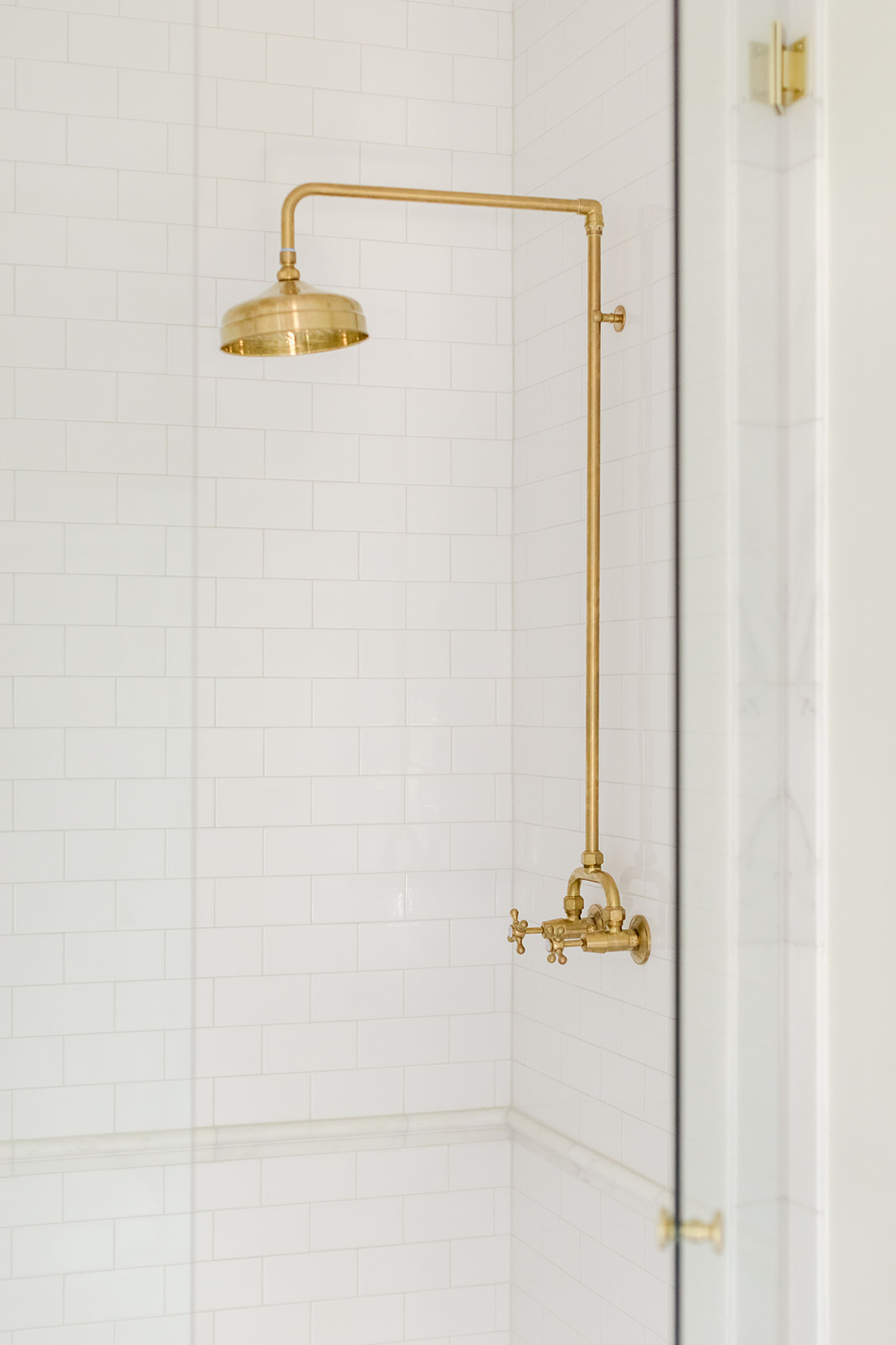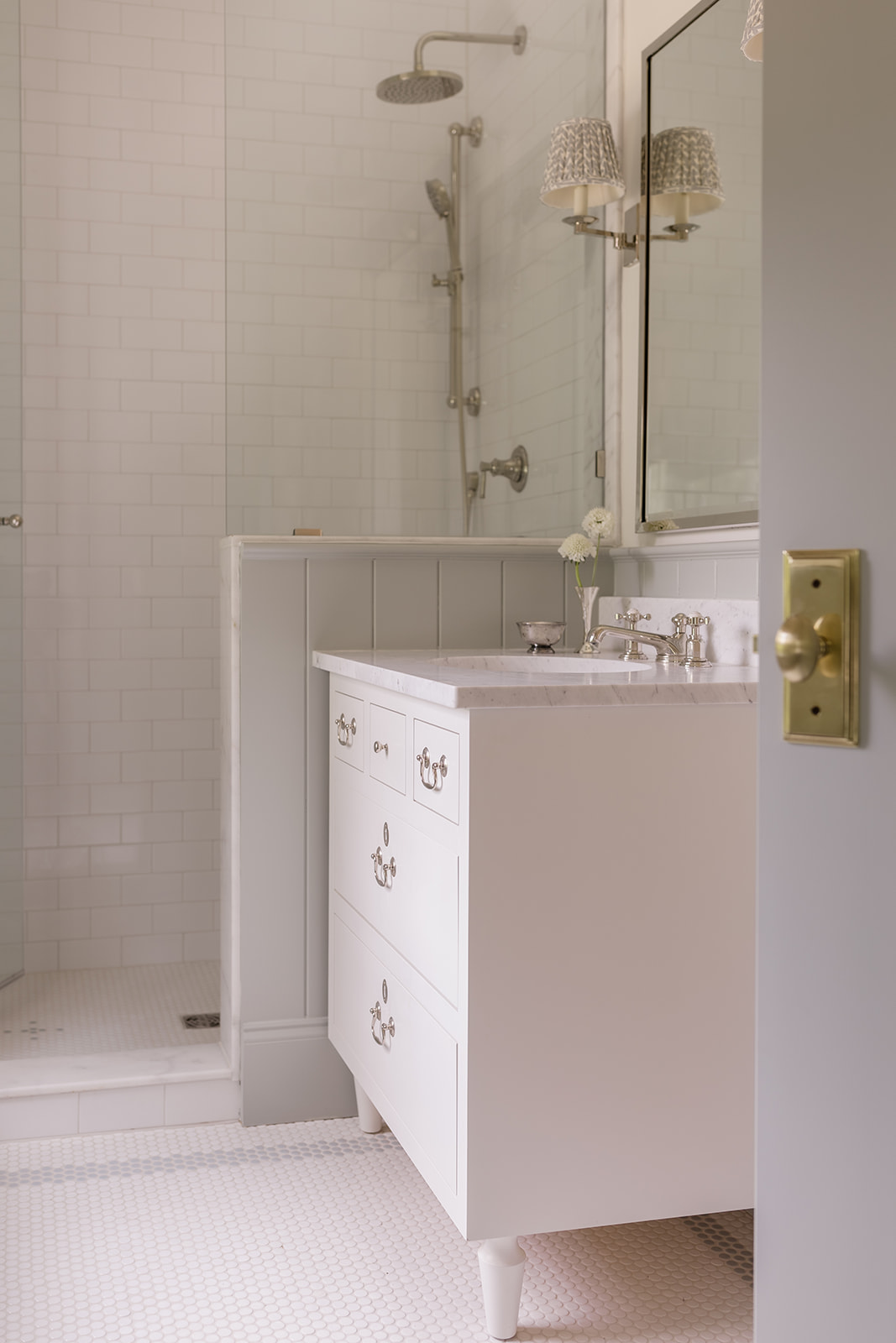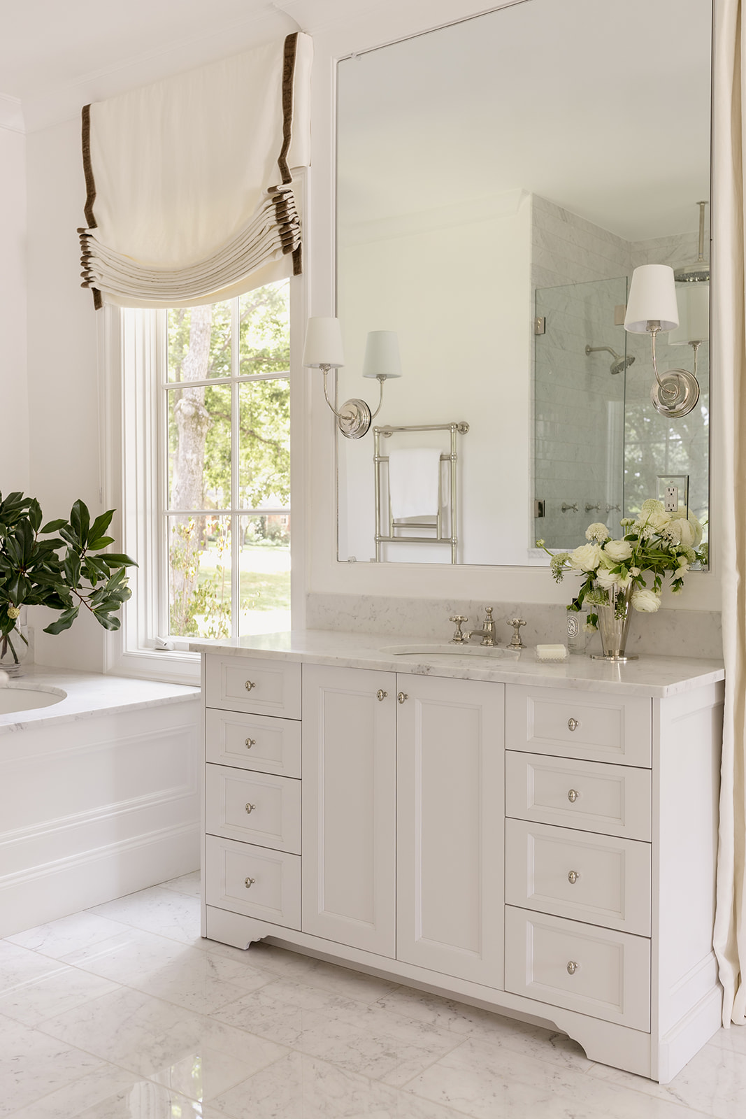 But while the guest bathrooms were an area I had a little more fun, the primary was when I got down to business. I wanted it to feel like if you lived in the Penthouse of a Ritz, tons of polished nickel, a touch of glam with the light fixtures and an insane moment with the tub. This space is very long so what I didn’t want to happen was that it felt too heavy on one side or overly cold because of all the tile. This tile and the countertops are a beautiful and subtle marble that not only exude luxury but also give a softness as well in the veining. It’s not too harsh or contrast so it’s just enough to show that’s it a real stone without being in your face. Did I mention the in-floor heating and towel warmer?
