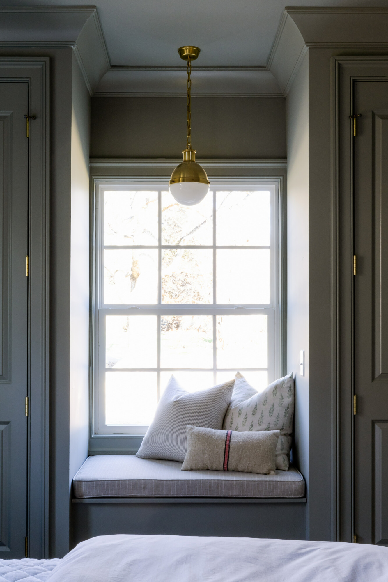 But one piece that I love about this room and the whole house is the number of storage benches. We had three throughout the house to include as much storage as possible and to keep the windows open natural light. The first is in here on the first floor, and the other two are upstairs in the primary closet and the rec room. All great places for storage and all complete with custom Schumacher bench cushions.