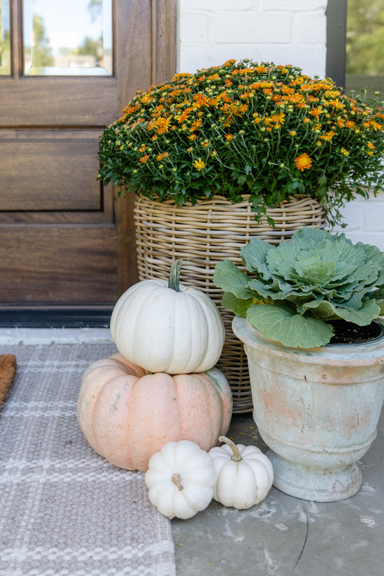 You can’t forget the planters!! Even if you don’t want to get a planter and just get a basket to plop a plant down into, the effect I believe of having live plants styled at your front door will immediately raise your grade 😀 I’ve had these rattan planters for years and love the basket-like feel to them as well as the neutral color that is great to pair with a stone planter. I found mine from a local garden center, but love the neutral look because it can go with any shade of pumpkin :-D.