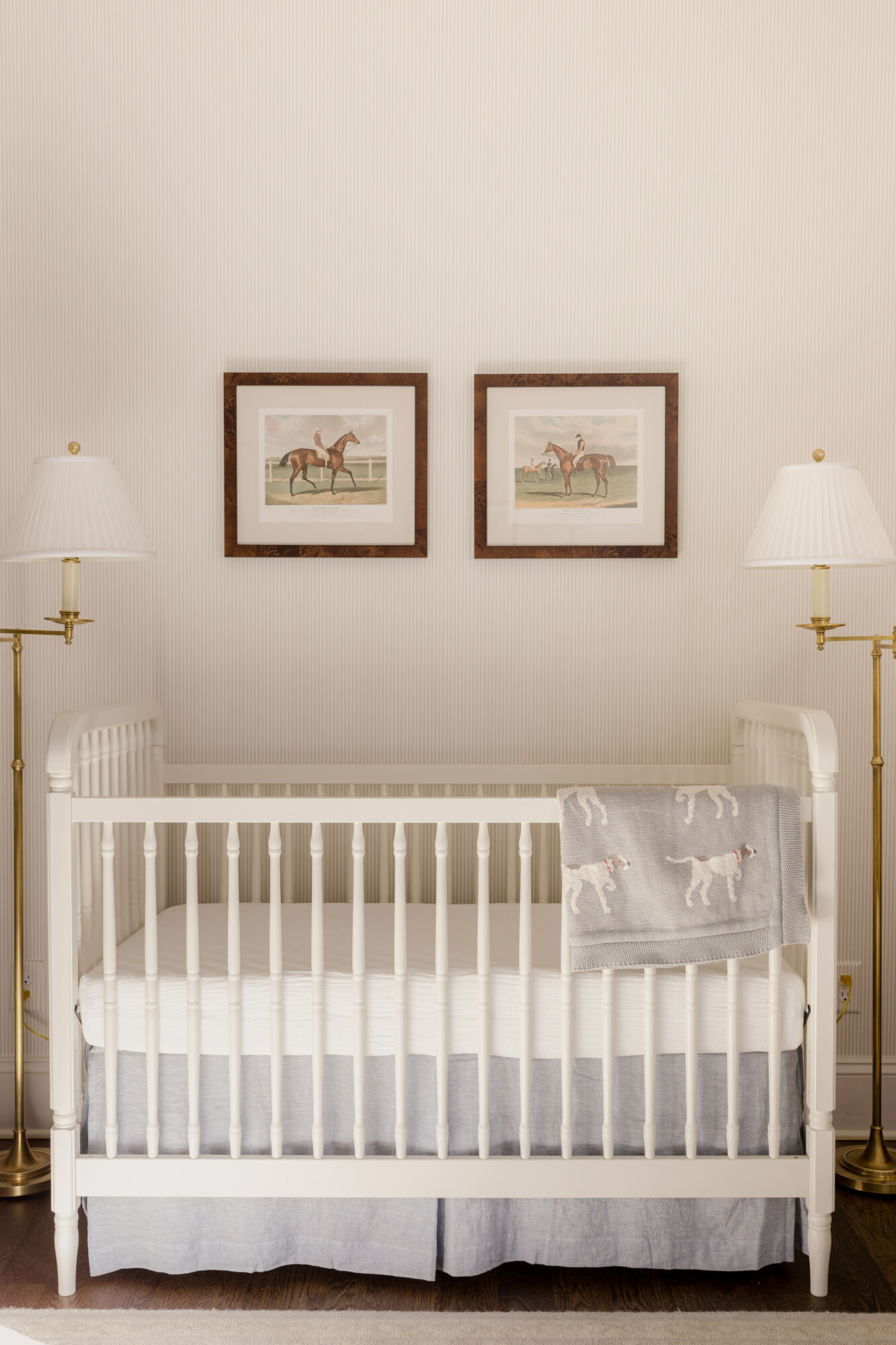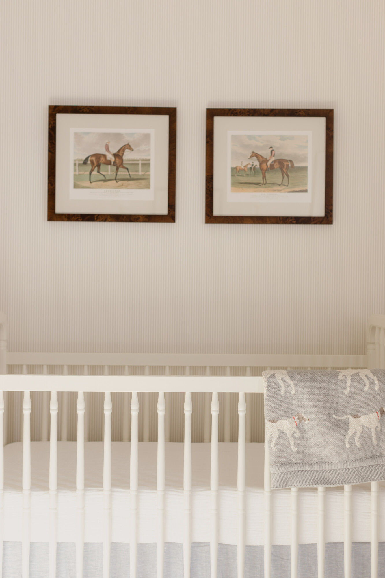 I decided to compliment the furniture piece with the custom framing of the artwork. I went back and forth with that artwork theme, vintage football photos, old cars, equestrian, etc. and decided to bring that Polo Ralph Lauren equestrian style back into the artwork. I love these pieces from Hart Equestrian, especially the vintage Parisian saddlery print. I’m hoping he’ll grow up loving The Colonel and wanting to keep him in his room as he gets older. And I’m actually obsessed with the light taupe matting we did around the jockey prints and how it blends with the wallpaper.
